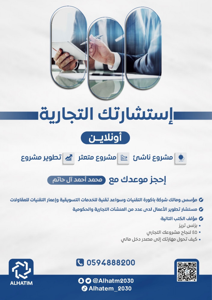 من خلالها يتم تنسيق لاتصال مباشر مع محمد آل حاتم لتقديم الاستشارة ، مدة الاستشارة (60 دقيقة)